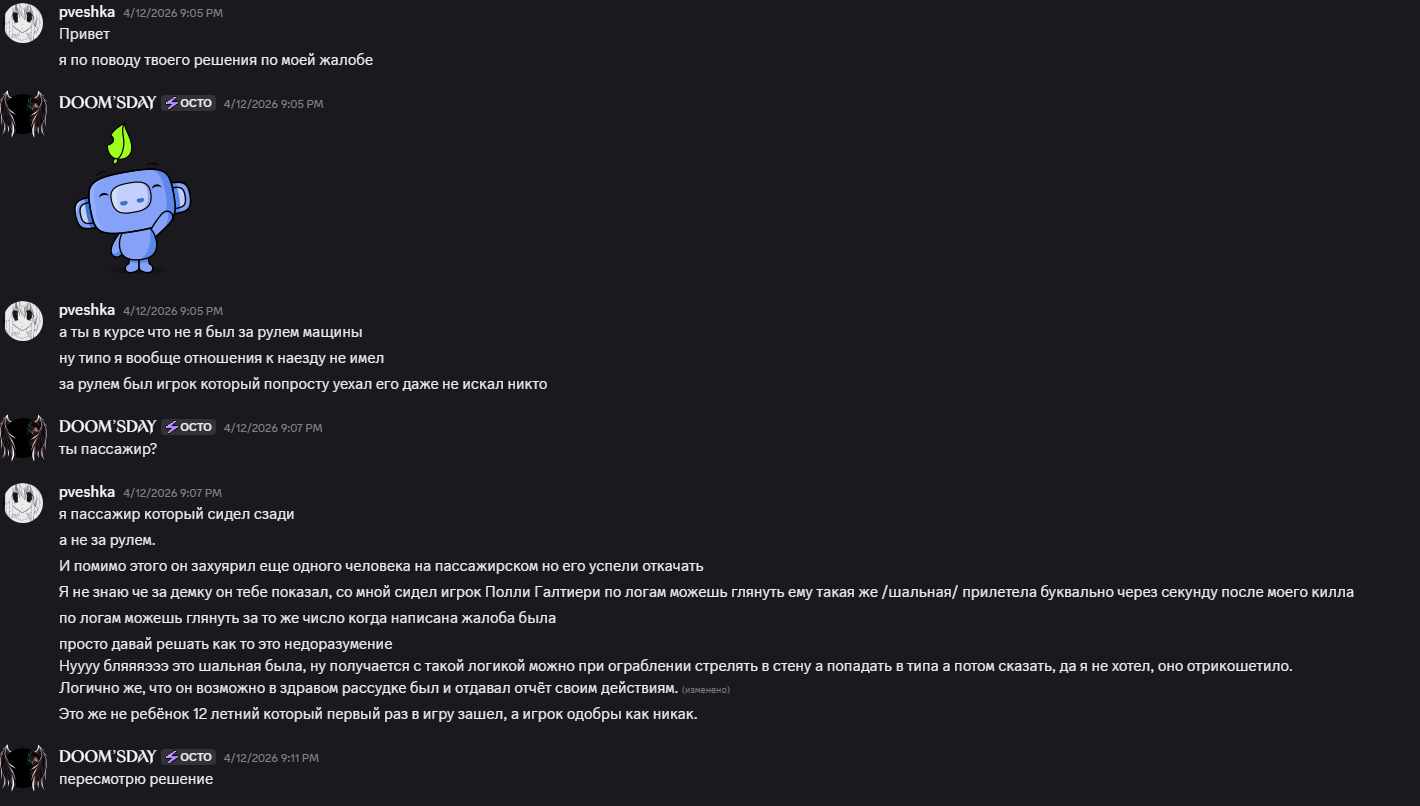 @Jorji-Vonel Получается сейчас он у тебя “дурачок”, а не FG, конкретно он во время всего рп процесса с ним хаха ловил и кидал оскорбления под наставленным оружием, поэтому и было решено его затопить, чтобы он “дурачок” понял всю серьёзность наших шуток (всякое может быть) своё несогласие он проявил уже после ситы в виде тикета.