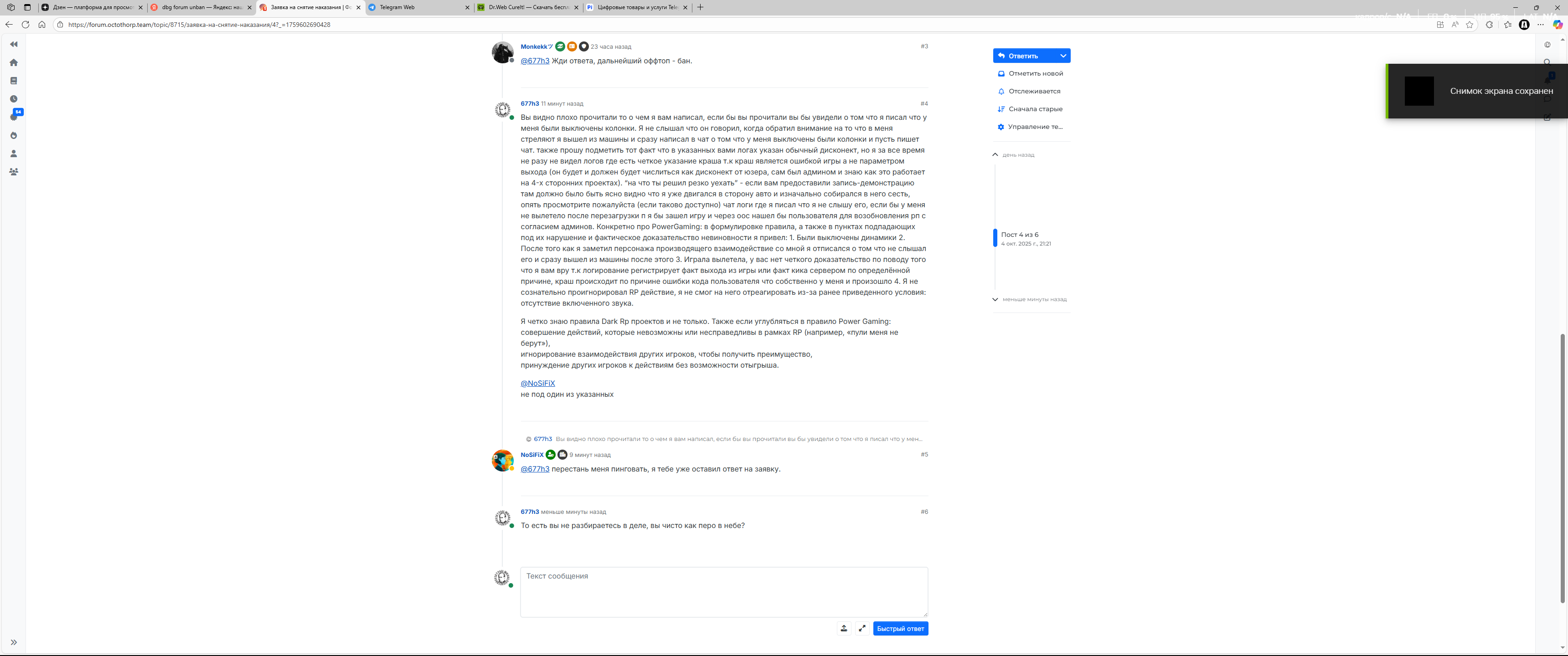 - Началось разбирательство по факту моего якобы преднамеренного лива с РП ситуации, доказательство по максимуму привел в самом деле. Админ отказывается продолжать разбирательство в моей жалобе якобы потому что он уже ответил и его не интересует приведенные мной факты. Прошу разобраться в данном деле и помочь решить ситуацию с работой данного админа.