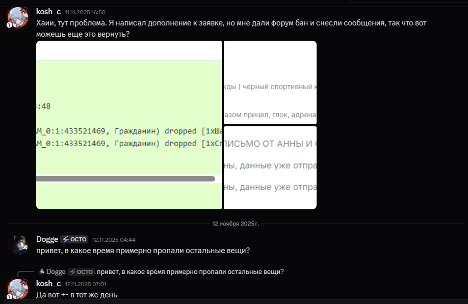 #217787887 [12 Feb, 1:13:32] Сайлент Англецид sent message to Сайлент Англецид's ticket: лут с куртки пропал, отследите по логам