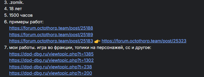 Шиза, конечно, лютая. Создаётся впечатление, что Зики в комьюнити очень мало находился. Все вышеперечисленные пользователи в твоей жалобе - давние игроки проектов Octothorp Team, имеющие за плечами не 1 тысячу часов прекраснейших РП ситуаций.