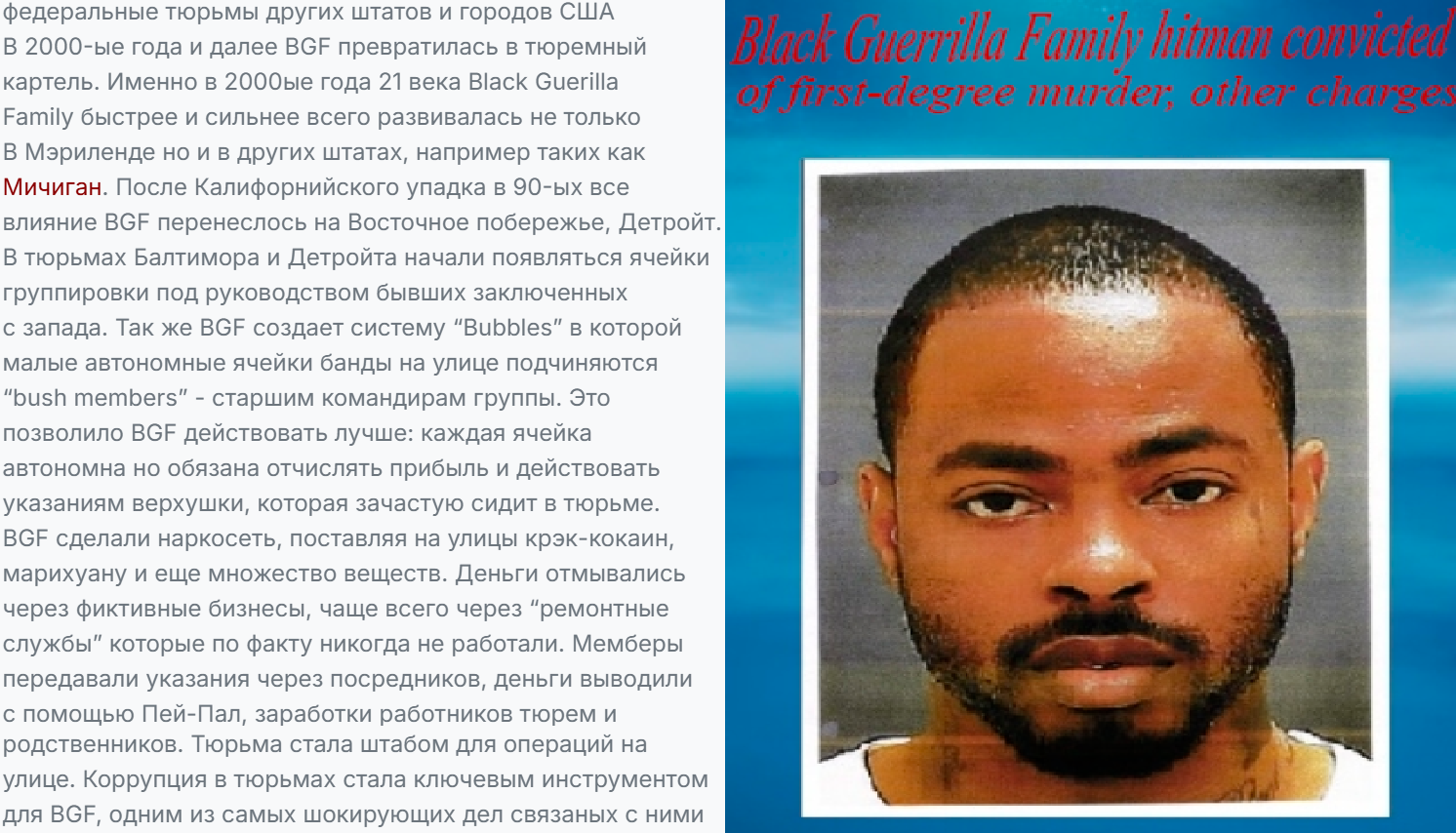 • сейчас бгф никакое отношение к тюремным доступам не имеет, это можно судить по инцидент репортам ко офицеров балтимора (что вы и играете по концепции) это больше просто уличная группировка (что глупо была сделана, оставочным действием в этой связи был замешан эрик браун, который и обучал молодое поколение) в итогом случае сейчас все что с ней связано это только опять же, уличная группировка, на равне с чикано сообществом и различными формированиями кровавых и/или калек, тебе бы лучше взять концепт калифорнии, там, уже более менее все известно, да и всё и идет как в бывалые времена: человек попадает в тюрьму, проходит консульство в члены бгф (раньше они набирались только через 415 куми, или дк блек, с которыми они воевали долгое время и даже были снисходительны совместно с аб, союзническая деятельность) да и у них на улицах осталось несколько людей, которые просто собирают налоги с других менее значительных банд, да и нужно запомнить, что единство джексона (после - браун) — обьединение чёрных под одним флагом (что джексон и вел в тюрьме, ведь был членом пантер) считай, это так происходит: чёрный попал за воровство или другой проступок (кроме сексуального насилия, что в машинах считается принизительным и они будут сидеть в закрытых секторах, предназначенных для людей, что сдали свою банду, или им нужна защита на период отсидки, ровно как и педофилия) и в тюрьме его накачивают пропагандой о нации, что чёрные лучше белых и у них равные права со всеми (взгляды брауна говорят о том, что белые должны быть уничтожены. взгляды джексона что они равны, и против наркотиков, ты их продаешь, но не употребляешь) и если человек доказал свое нравие, он принимает клятву, и уже на выходе из тюрьмы (если он не был в банде) попадает в экипаж на воле, который и занимается транспортировкой наркотиков в тюрьму, берут налоги, и нагружают банды наркотиками имея свой большой процент (а те в свою очередь находятся под защитой). если же он был в банде, то для него бгф номер один, и ровно как с остальными бандами они уходят на второй план, если ты не будешь помогать бгф, как она помогла тебе в тюрьме — тебя убьют, и не стоит забывать что у них своя ранговая система: центральный комитет (который распространен на все тюрьмы, но сейчас там никого нет, и это больше генералов там) - сами полевые генералы - капитаны, лейтенанты, и обычные солдаты, считай, равнозначно системному обозначению ровно как и ММ, НФ+