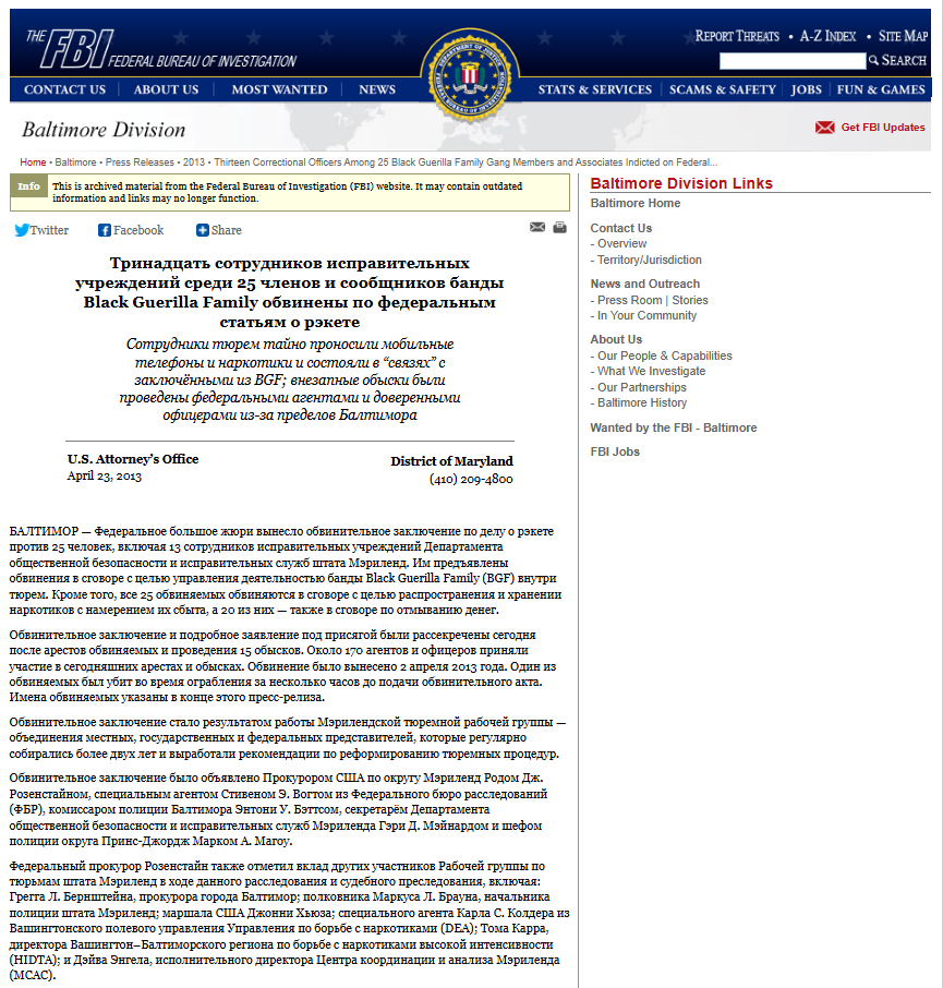 стало то, как BGF внедрилось в администрацию тюрем, стало известно что один из лидеров распоряжался тюрьмой как хозяин. Группировка подкупила охранников и медработников, использовала первых как курьеров, дошло до того что некоторые из коррекционных офицерш вступали в отношения с лидерами группировки. Так же BGF контролировали кто в какие камеры попадает, распределяла пищу, телефоны, сигареты и наркотики которые доставляли в тюрьму “свои” охранники. Самым вопиющем случаем стало дело 2013г раскрытое Федеральным Бюро Расследований. Тэвон Уайт имел отношения с 13-ю охранницами 4-ро из которых забеременели от него, зарабатывал около 15.000$ в месяц с контрабанды, распоряжался переводами и управлял прочей охраной исправительного учреждения.