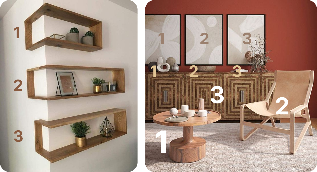 “Правила Трех” — это прием, для расставления мебели, декора и вообще различных объектов. Оказывается что нам людям приятнее смотреть на композиции нечетных кол-во предметов, это золотая середина ведь именно три предмета выглядит как завершенная композиция, то есть: “не мало, не много”. Любые три предмета можно объединить в композицию , если у них совпадает хотя бы один признак: форма, цвет или размер.
