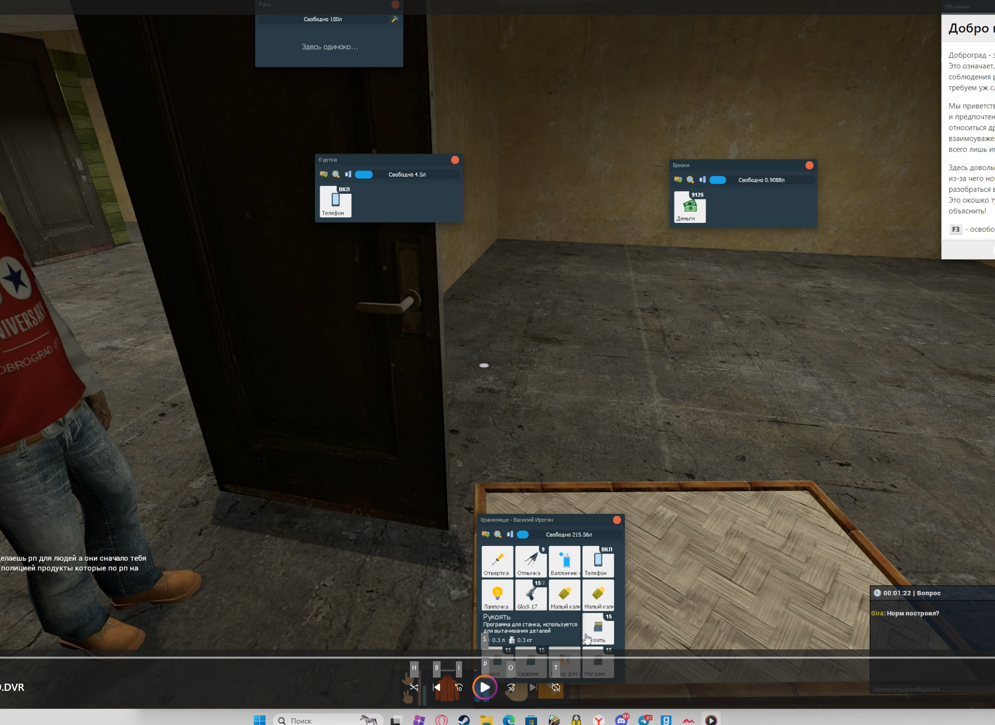 Log report generated 10 Feb, 2:55:12 #216549244 [31 Jan, 15:41:14] Василий Ирогин (STEAM_0:0:585399509, Гражданин, Руки) unequipped mask Пакет на голову #216550591 [31 Jan, 15:51:17] Василий Ирогин (STEAM_0:0:585399509, Гражданин, Руки) moved [1xGlock 17]: [Василий Ирогин (STEAM_0:0:585399509)'s Куртка]➞[Хранилище - Василий Ирогин (models/mark2580/gtav/mp_apa_mid/bedroom/v_res_tre_storagebox_high.mdl)] #216550598 [31 Jan, 15:51:19] Василий Ирогин (STEAM_0:0:585399509, Гражданин, Руки) moved [1xGlock 17]: [Василий Ирогин (STEAM_0:0:585399509)'s Руки]➞[Хранилище - Василий Ирогин (models/mark2580/gtav/mp_apa_mid/bedroom/v_res_tre_storagebox_high.mdl)] #216550600 [31 Jan, 15:51:20] Василий Ирогин (STEAM_0:0:585399509, Гражданин, Руки) moved [1xМалый калибр]: [Василий Ирогин (STEAM_0:0:585399509)'s Куртка]➞[Хранилище - Василий Ирогин (models/mark2580/gtav/mp_apa_mid/bedroom/v_res_tre_storagebox_high.mdl)] #216550604 [31 Jan, 15:51:22] Василий Ирогин (STEAM_0:0:585399509, Гражданин, Руки) moved [1xМалый калибр]: [Василий Ирогин (STEAM_0:0:585399509)'s Брюки]➞[Хранилище - Василий Ирогин (models/mark2580/gtav/mp_apa_mid/bedroom/v_res_tre_storagebox_high.mdl)] #216550610 [31 Jan, 15:51:24] Василий Ирогин (STEAM_0:0:585399509, Гражданин, Руки) moved [3xПластырь]: [Василий Ирогин (STEAM_0:0:585399509)'s Брюки]➞[Хранилище - Василий Ирогин (models/mark2580/gtav/mp_apa_mid/bedroom/v_res_tre_storagebox_high.mdl)] #216550725 [31 Jan, 15:52:51] Player disconnected: Василий Ирогин (STEAM_0:0:585399509, Гражданин, Руки), Disconnect by user. Participants: STEAM_0:0:585399509