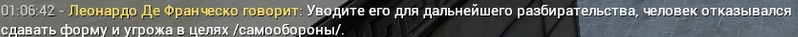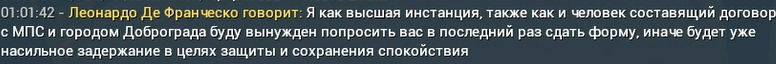 прямо в мэрии он нашел зеленых человеков в хазматах, решил тоже сделать фоточки на их фоне чтоб засунуть в пресс-релиз и потом… вызвал меня с инспекции чтобы сказать “снимай форму”, ведь так стопроцентно увольняют сотрудников, а особенно в госорганах. медиум рп мэр несколько раз сказал, что он является высшей инстанцией, чтоб я снимал форму и если я это не сделаю, то для “обеспечения безопасности и спокойствия” меня задержат. при этом важно понимать, что официально никто меня не увольнял и об этом говорит сам персонаж леонардо де франческо. так на каком основании это произошло? в результате он спустил на меня своего личного охранника, который угрожая оружием с меня снял тактический пояс и сдал полицейскому, которому сказали “играйте в ит”.
