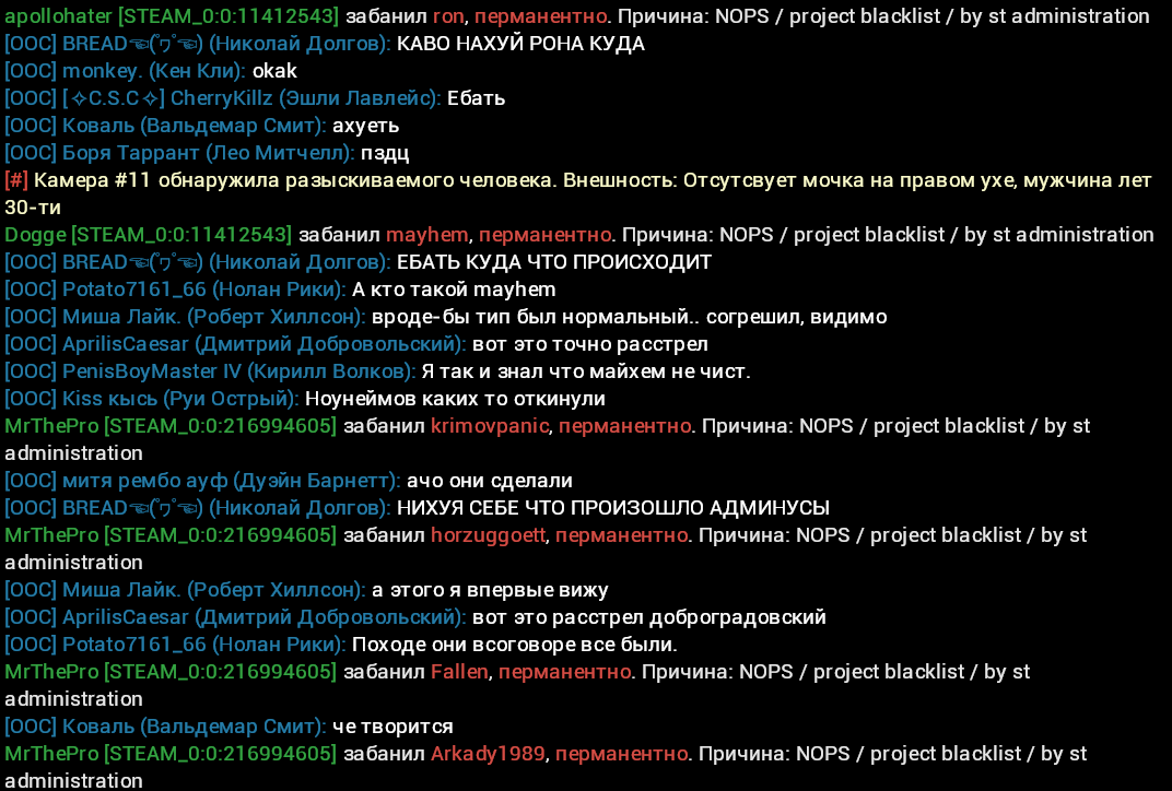 - STEAM_0:0:445947168 - gush, STEAM_0:1:180235778 - Fallen, STEAM_0:0:440978879 - Arkady1989, STEAM_0:1:154034303 - uHBecT0P_B_XaMcTep_K0M6AT, STEAM_0:1:120088776 - horzuggoett