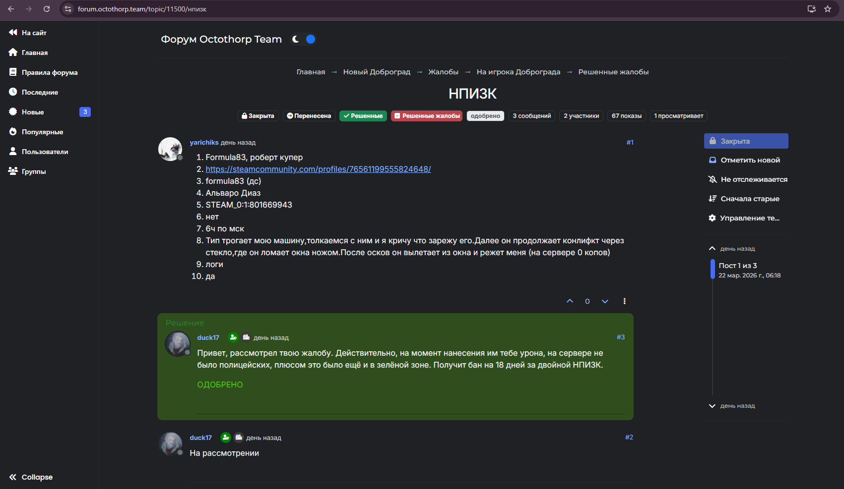 - Была сита с типом, тип подал на меня на форум и указал там смотрите по логам, админ не смотрел демку нету доков и не знает какая ситуация вообще была и просто меня откинул.