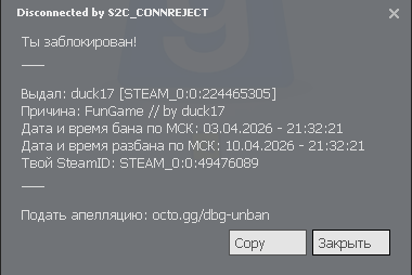 Вид наказания (если бан, то приложить скриншот окна блокировки; загружать сюда)