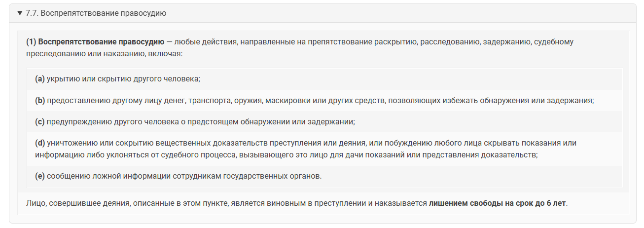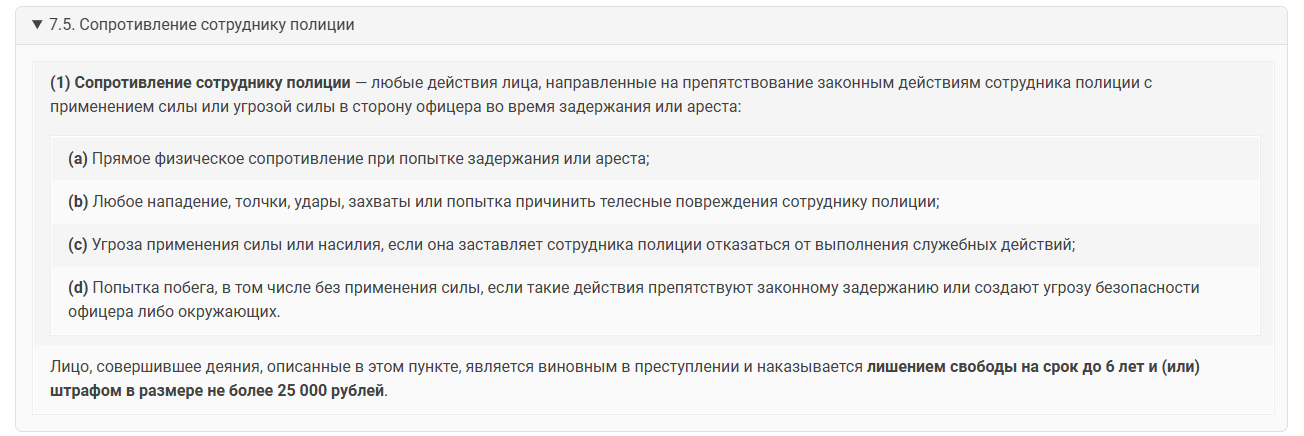 сопротивлялся какому расследованию? мне четко несколько раз сказали о том, что оно только БУДЕТ заведено. аналогичная ситуация и с уголовным преследованием моего персонажа — кейс-файл будет только составляться, а значит никакого дела против меня открыто не было. да и почитай эту статью про воспрепятствование правосудию, неужели так сложно буковки прочитать и понять, что подпунктов, нарушенных мною — нет. со статьей про сопротивление тоже интересная ситуация. где и каким образом я угрожал следователю? пистолет к его виску приставил? обнажить оружие полицейский может при потенциальной угрозе жизни, что и произошло после эскалации ситуации т.н. следователем овр. да и никакое задержание или арест не происходили, ведь меня пытались ОТСТРАНИТЬ, что ни к первому, ни ко второму не относится