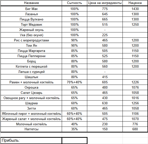 О первой таблице особо нет смысла говорить, так как там всё в целом понятно. В 1 колонке - название, 2 - сытость (там где +, это ещё и комбо), наценка - цена, которую вы сами устанавливаете, т.е. условно пишите: