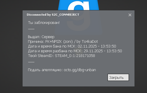 - Вид наказания (если бан, то приложить скриншот окна блокировки; загружать сюда ) : https://imgur.com/a/3pYlCRC