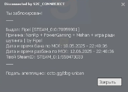 Билли Бонпенсьеро (STEAM_0:1:98921962) получает блокировку сроком на 5 дней за нарушение следующих правил: FK, НПИЗК, FG.