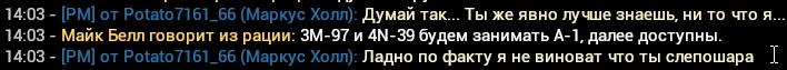Маркус Холл (STEAM_0:1:755664602, Полицейский медик) successfully executed chat command: /pm "Альберт Мартинез" Думай так... Ты же явно лучше знаешь, ни то что я...