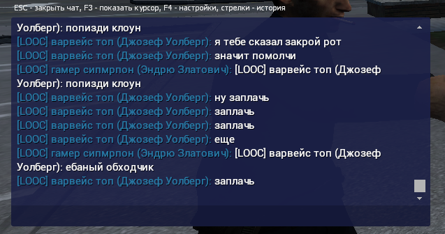 8. Парень с мэром убил типа и ограбил его, мы решили догнать его машину и остановили возле обочины, его “охранник” (мэра) достал и начал по нам стрелять, мой напарник его убил и после этого он начал нас оскорблять в ООС чате на почве ненависти. Также с нами был новичок который задонатил на сервер и купил машину, мэр его собственно называл “Обходер”. Когда я спросил почему ты даже мэрию не обустроил для работы и играешь в свою пользу он мне сказал, мол “я делаю лотереи и лицухи раздаю всем, а значит я выполняю работу мэра” (лицензию он выдал только своему другу-охраннику).