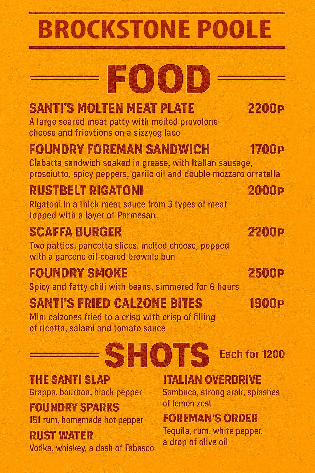 Он знал что своим не нужны ужины при свечах, прочий гламур. Он снял помещение, потратил часть сбережений на то что бы ободрать стены до кирпичей, купить немного мебели: барные стулья, стойки, пару холодильников, цокольный этаж законсервировал потому как денег на его обстройку не было на начале, так появился Брокстон Пул.