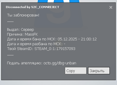 Вид наказания (если бан, то приложить скриншот окна блокировки; загружать сюда)