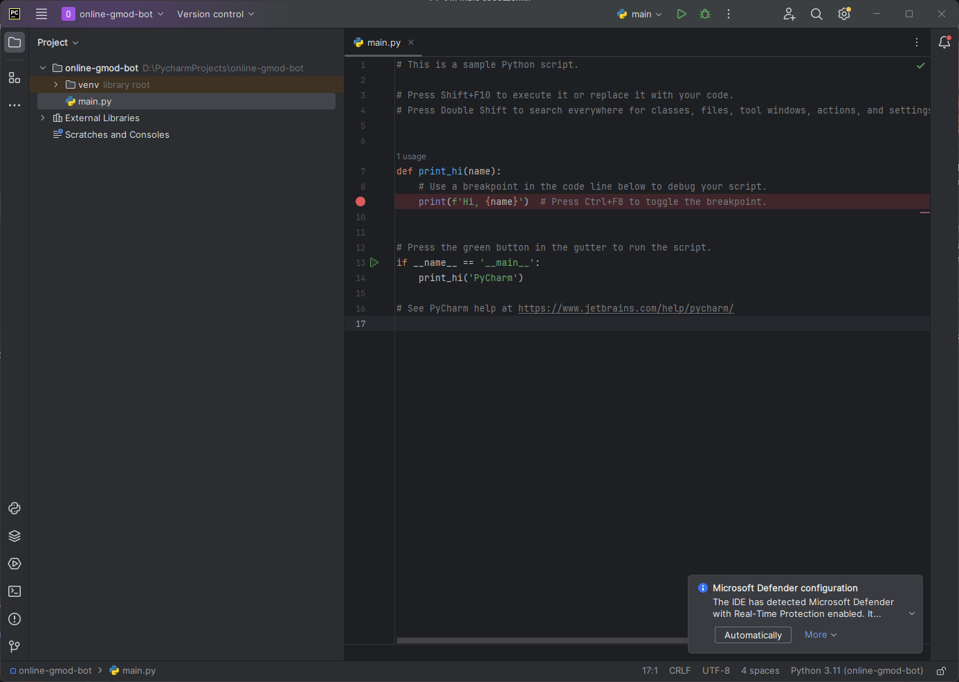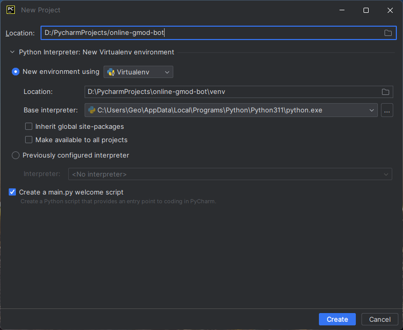 Дальше необходимо указать где будут храниться ваш проект, в моем случае D:/PycharmProjects/online-gmod-bot