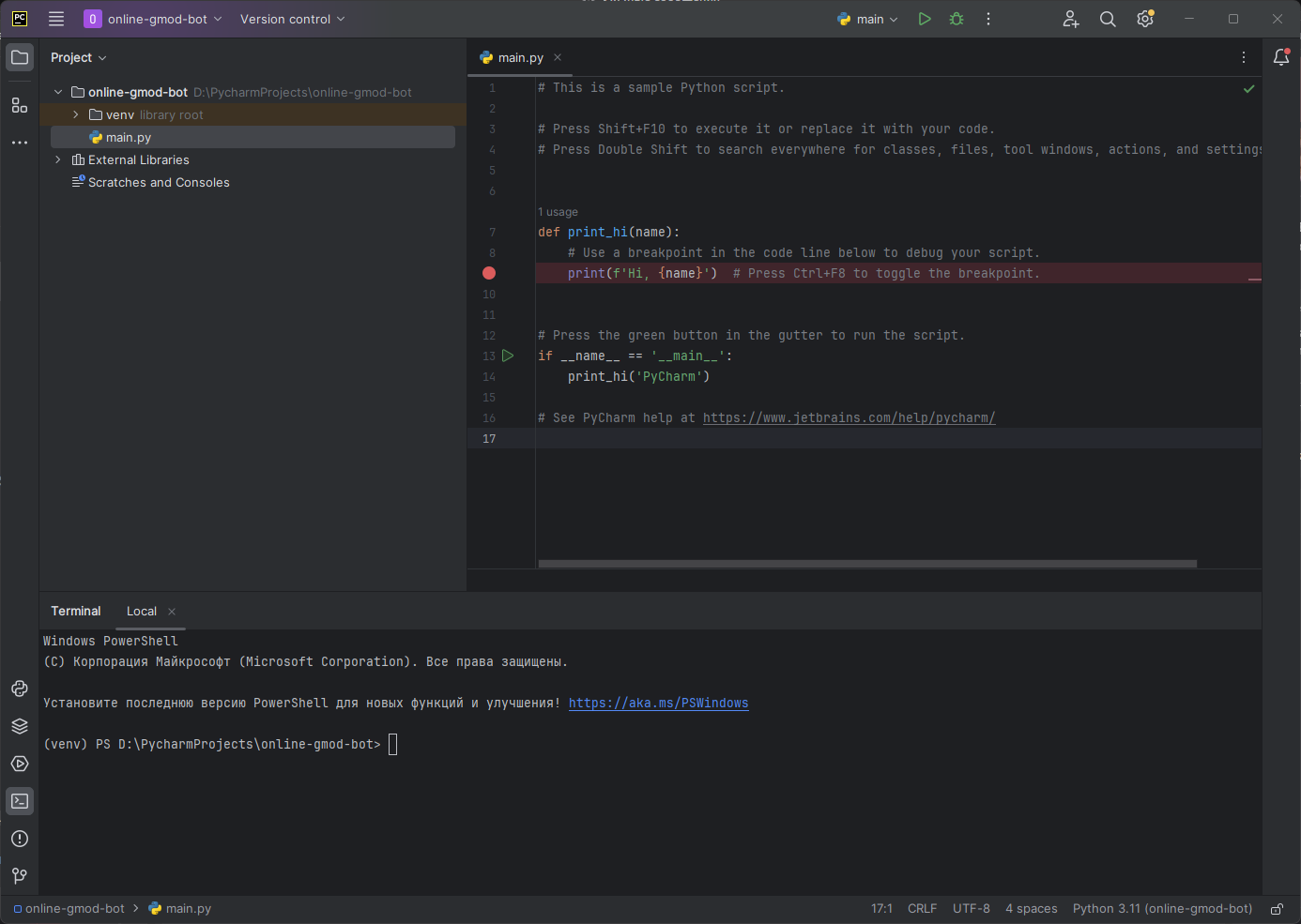 Открывается powershell с уже активированным venv, опять же очень удобно, экономит время.