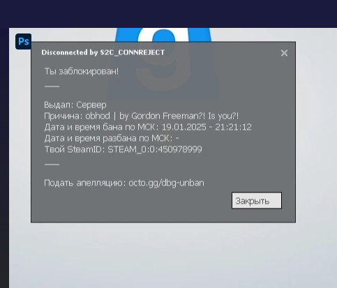 - Вид наказания (если бан, то приложить скриншот окна блокировки; загружать сюда) https://imgur.com/a/Et2pSe7